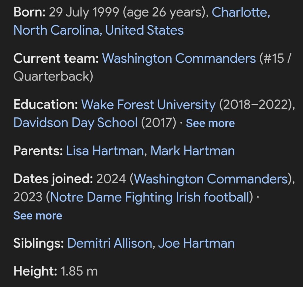 Despite an impressive collegiate resume, Hartman went undrafted in 2024 but quickly found a path forward with the Washington Commanders as a free agent . He signed a reserve/future contract in early 2025, proving his perseverance and readiness .