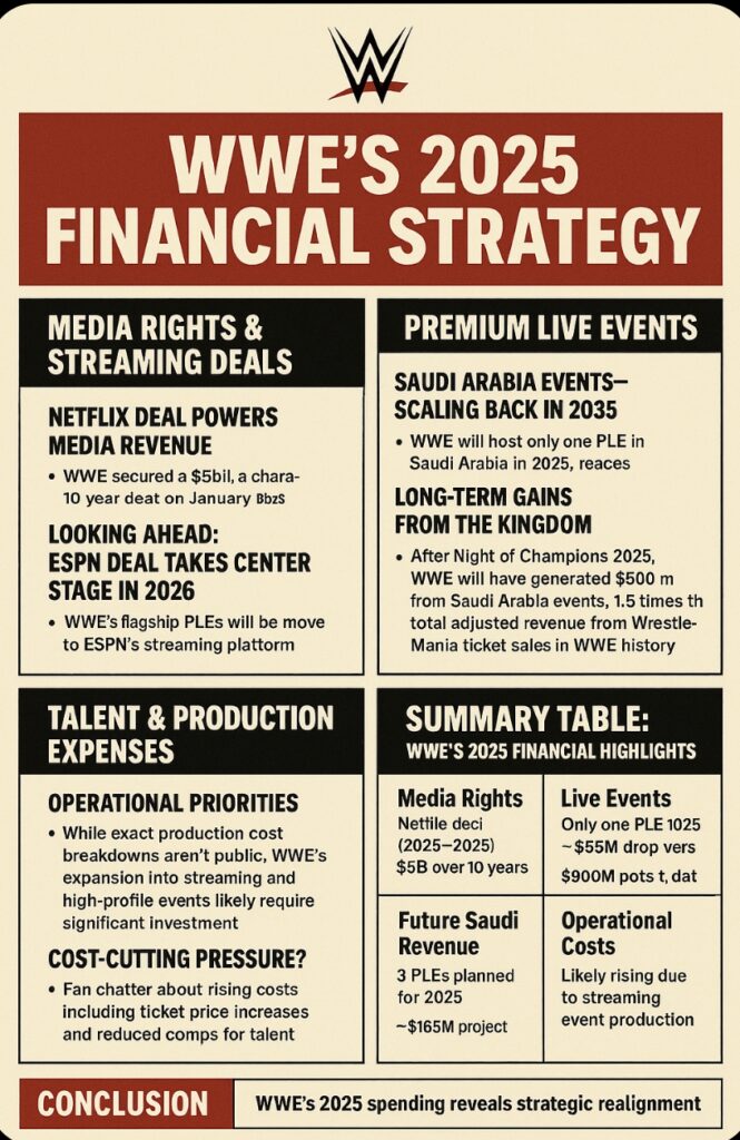 WWE’s 2025 spending tells a story of strategic realignment. Media rights revenue is booming—thanks to massive deals with Netflix and ESPN. Live event revenues face a dip due to fewer Saudi shows in 2025, though gains loom in 2026. Behind the numbers, operational costs and rising ticket prices hint at a company balancing investment with tightening profitability.